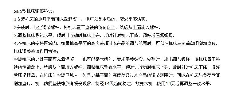 將墊鐵放置機(jī)床下,每個(gè)墊鐵均受力后.再調(diào)整水平。 注:可調(diào)整高度為3-15mm. |
